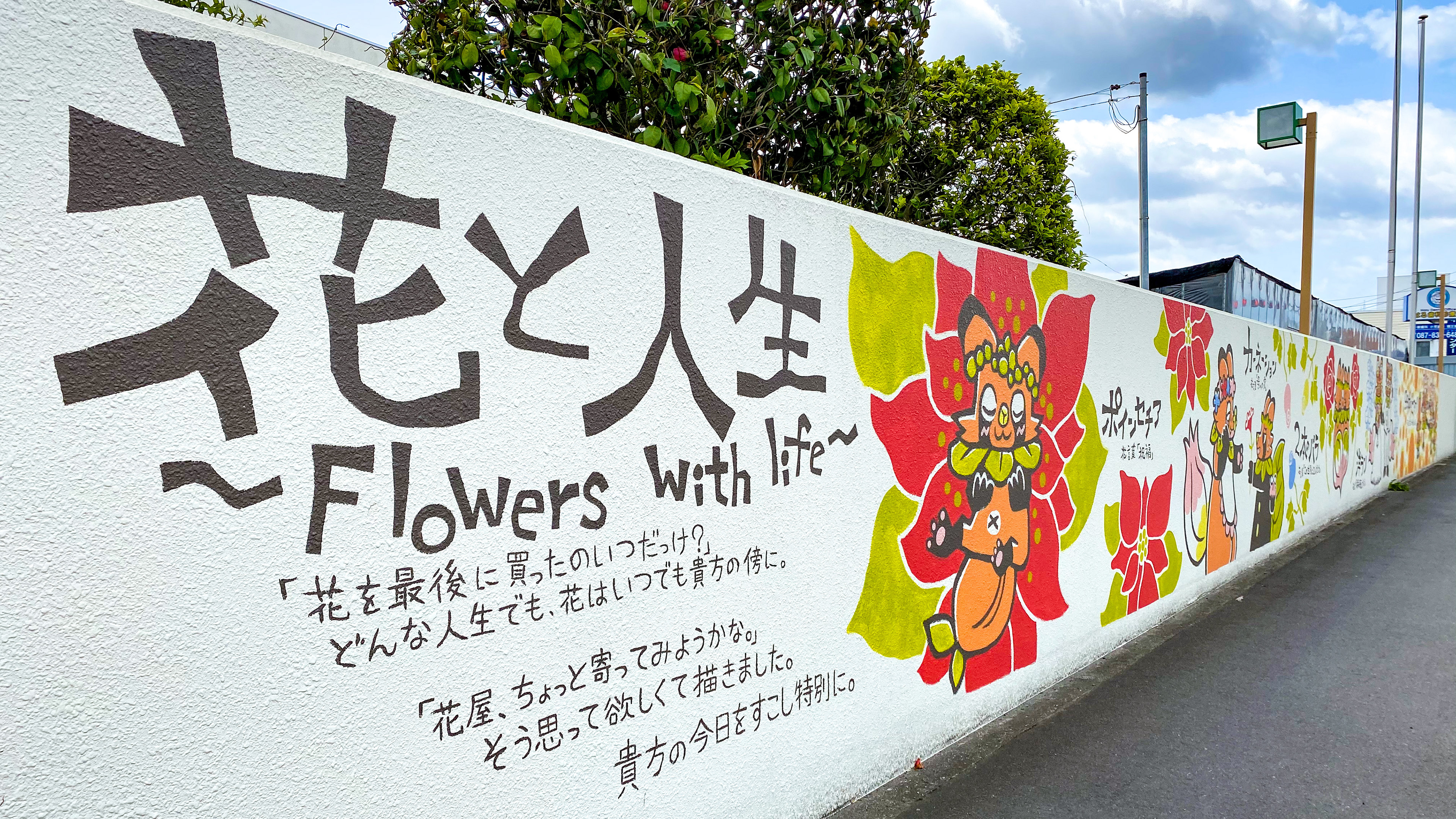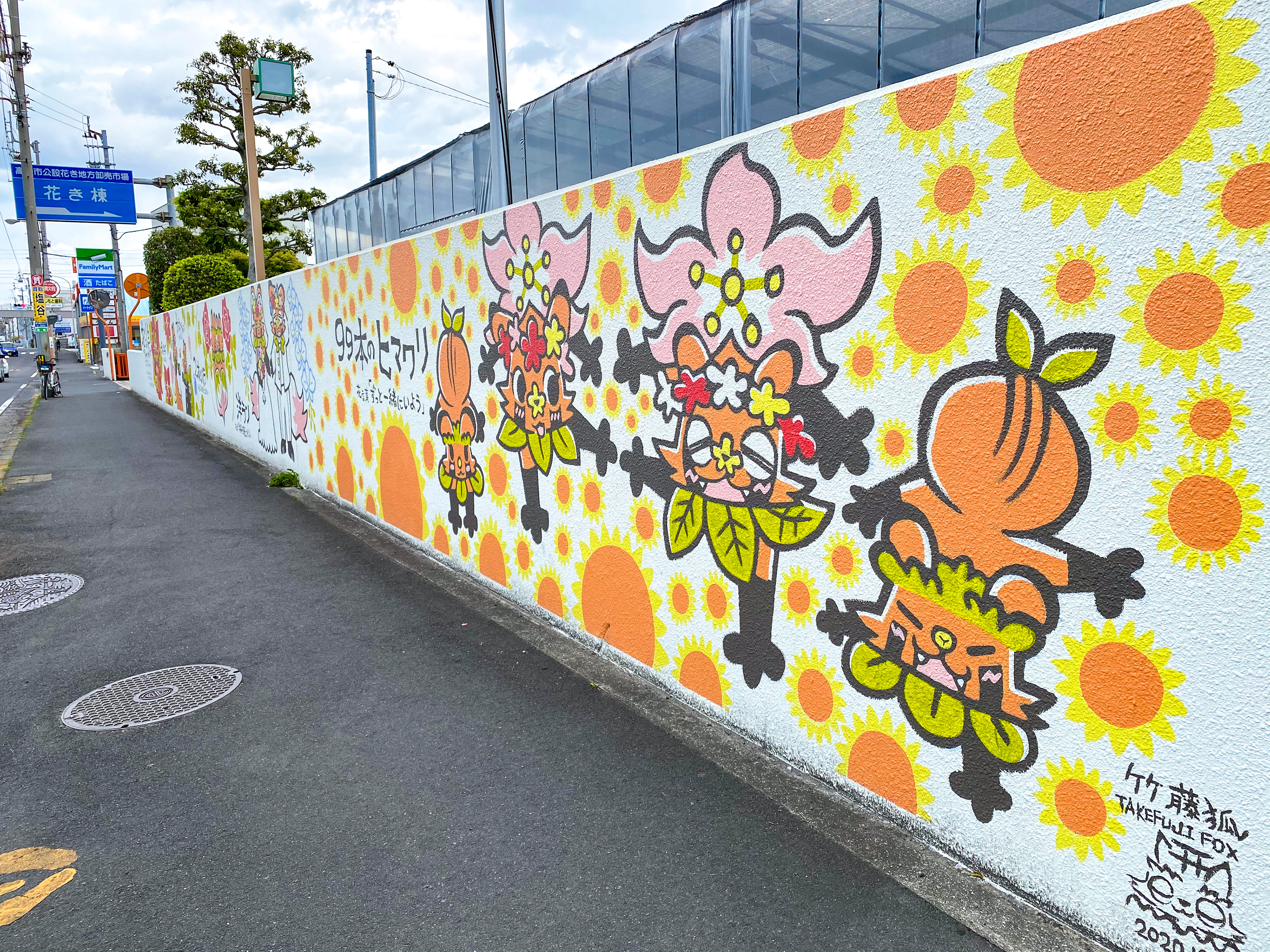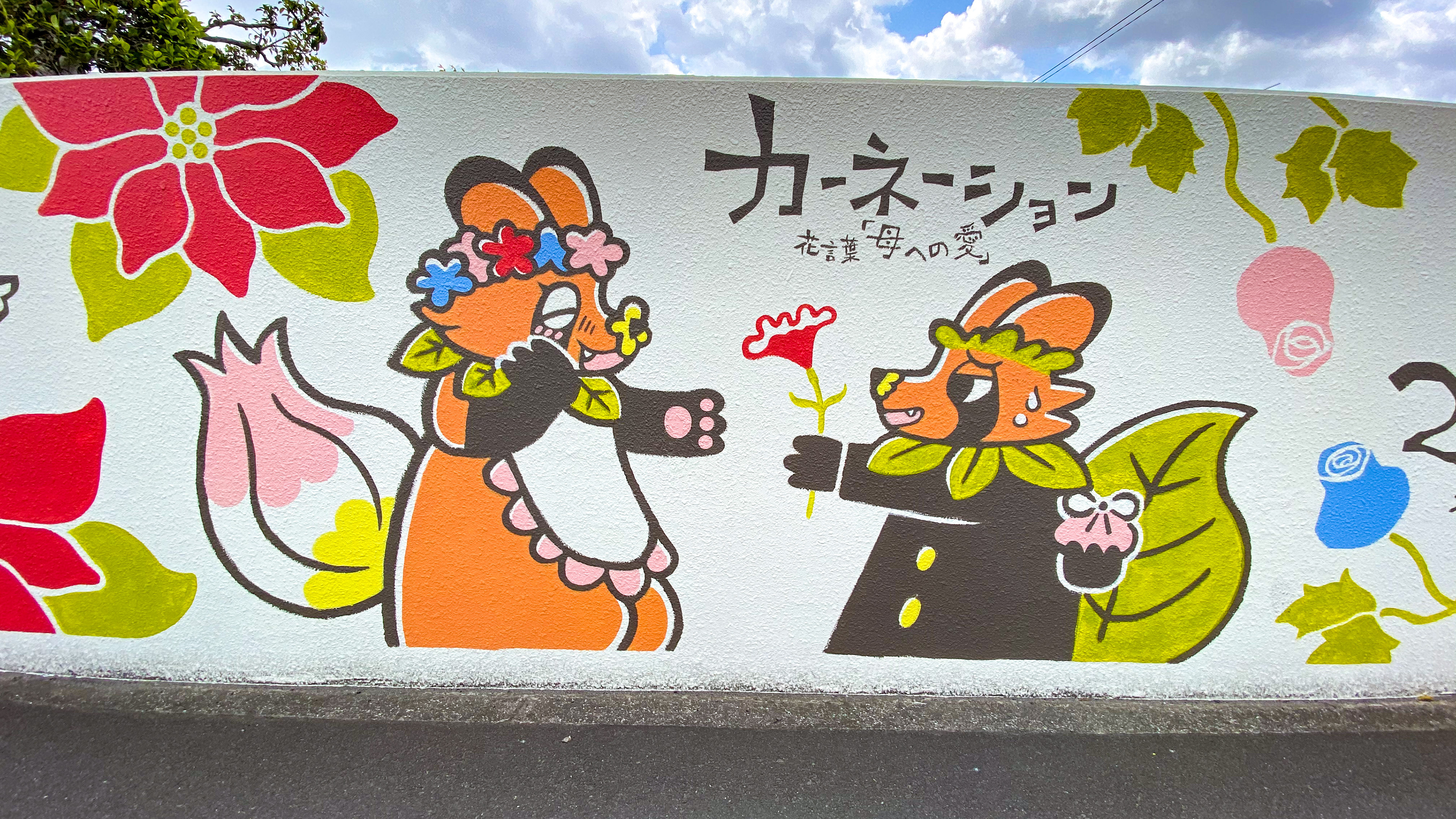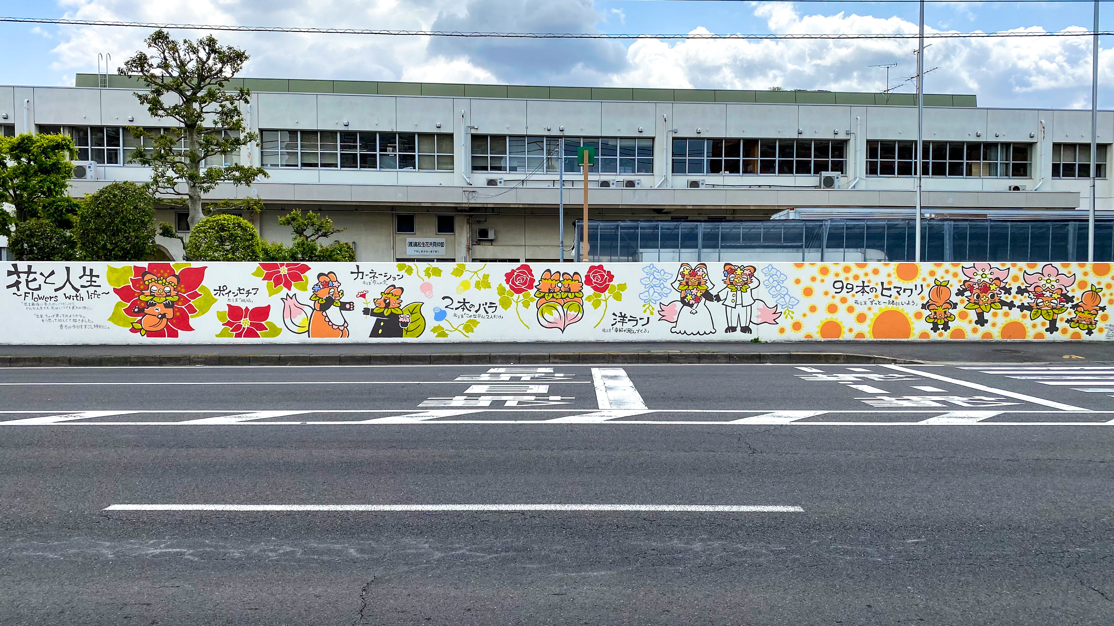 I painted a mural for the outer wall of "Takamatsu Sea & Sun Market" in Takamatsu City, Kagawa Prefecture. The elongated wall is likened to a picture scroll, expressing a story the flower raccoon dog character "Hanatanuki" with full of flowers. The story is sprinkled with Language of flowers and devised so that passersby will be interested in flowers.