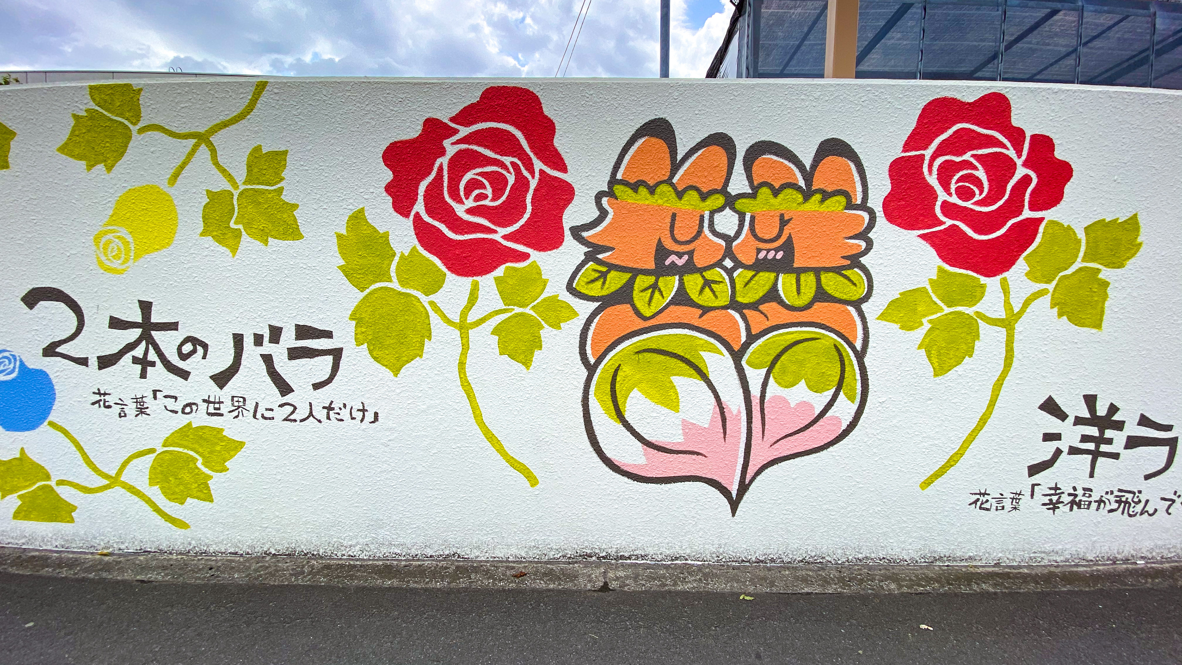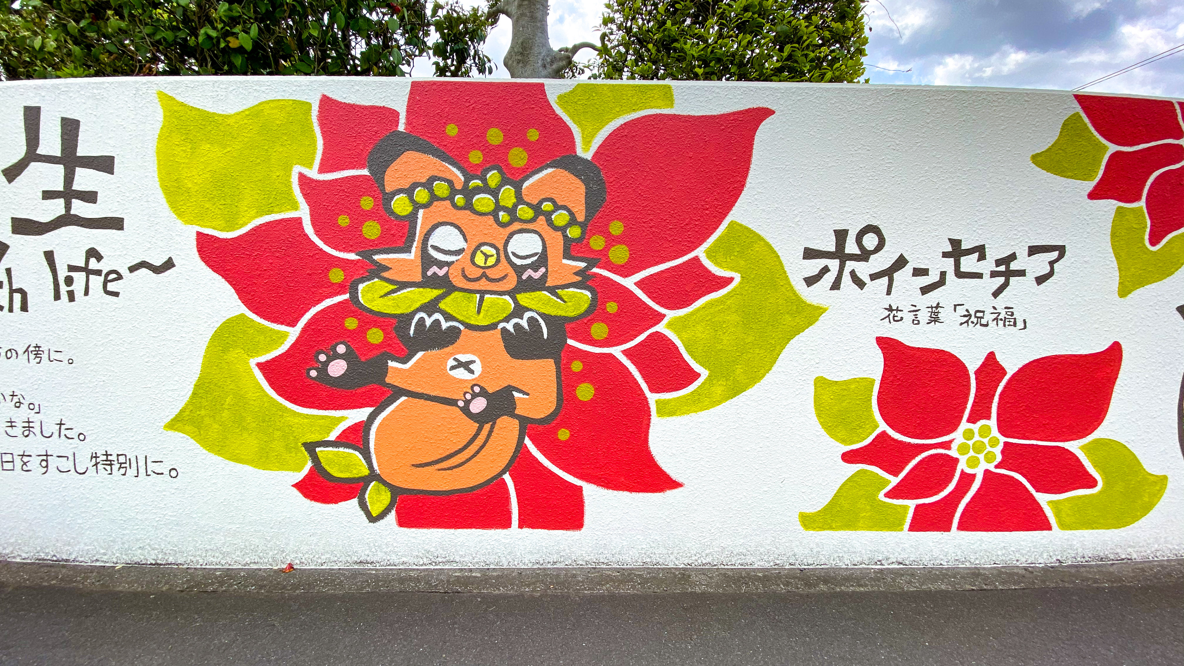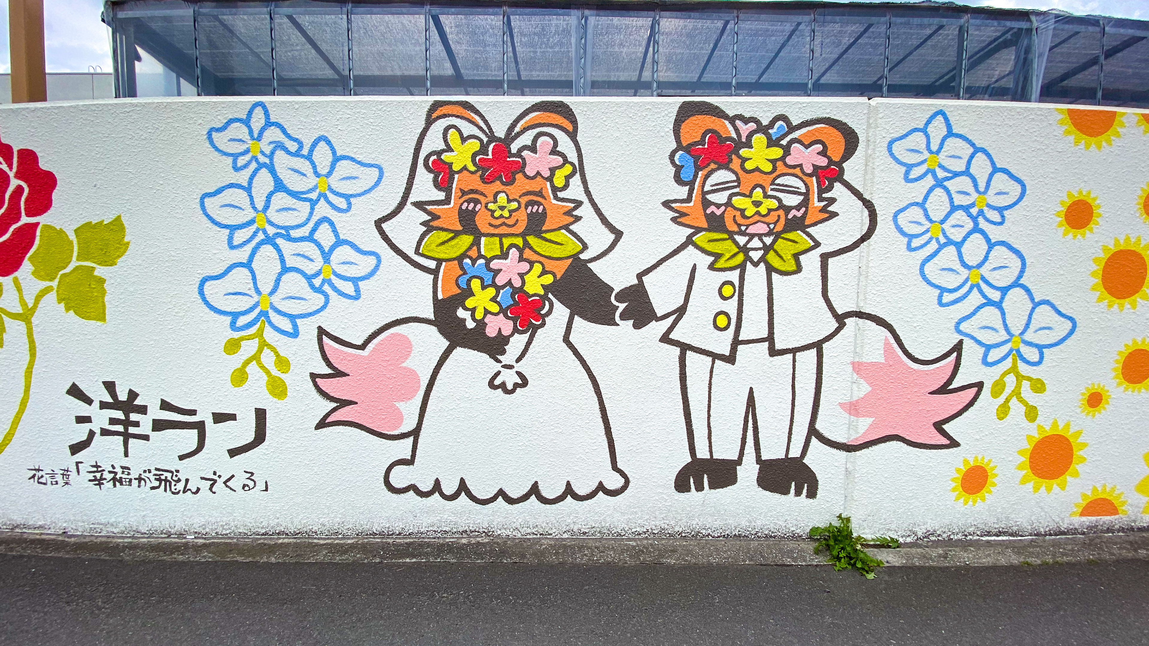I painted a mural for the outer wall of "Takamatsu Sea & Sun Market" in Takamatsu City, Kagawa Prefecture. The elongated wall is likened to a picture scroll, expressing a story the flower raccoon dog character "Hanatanuki" with full of flowers. The story is sprinkled with Language of flowers and devised so that passersby will be interested in flowers.