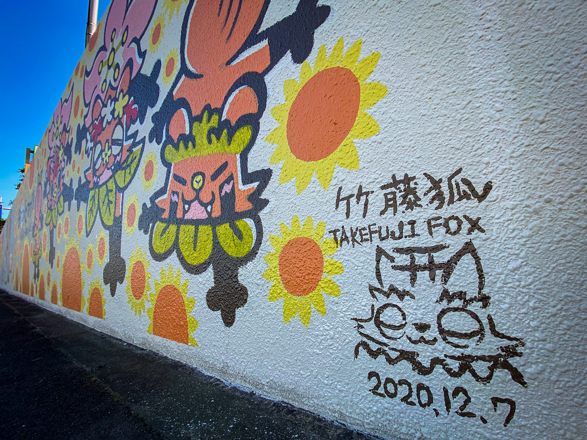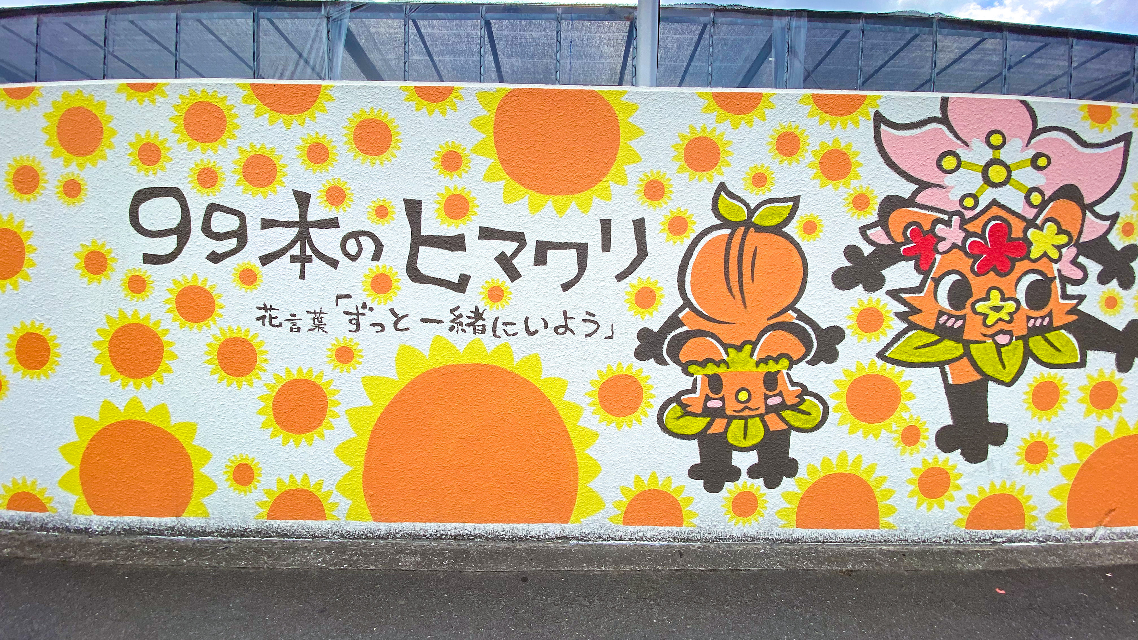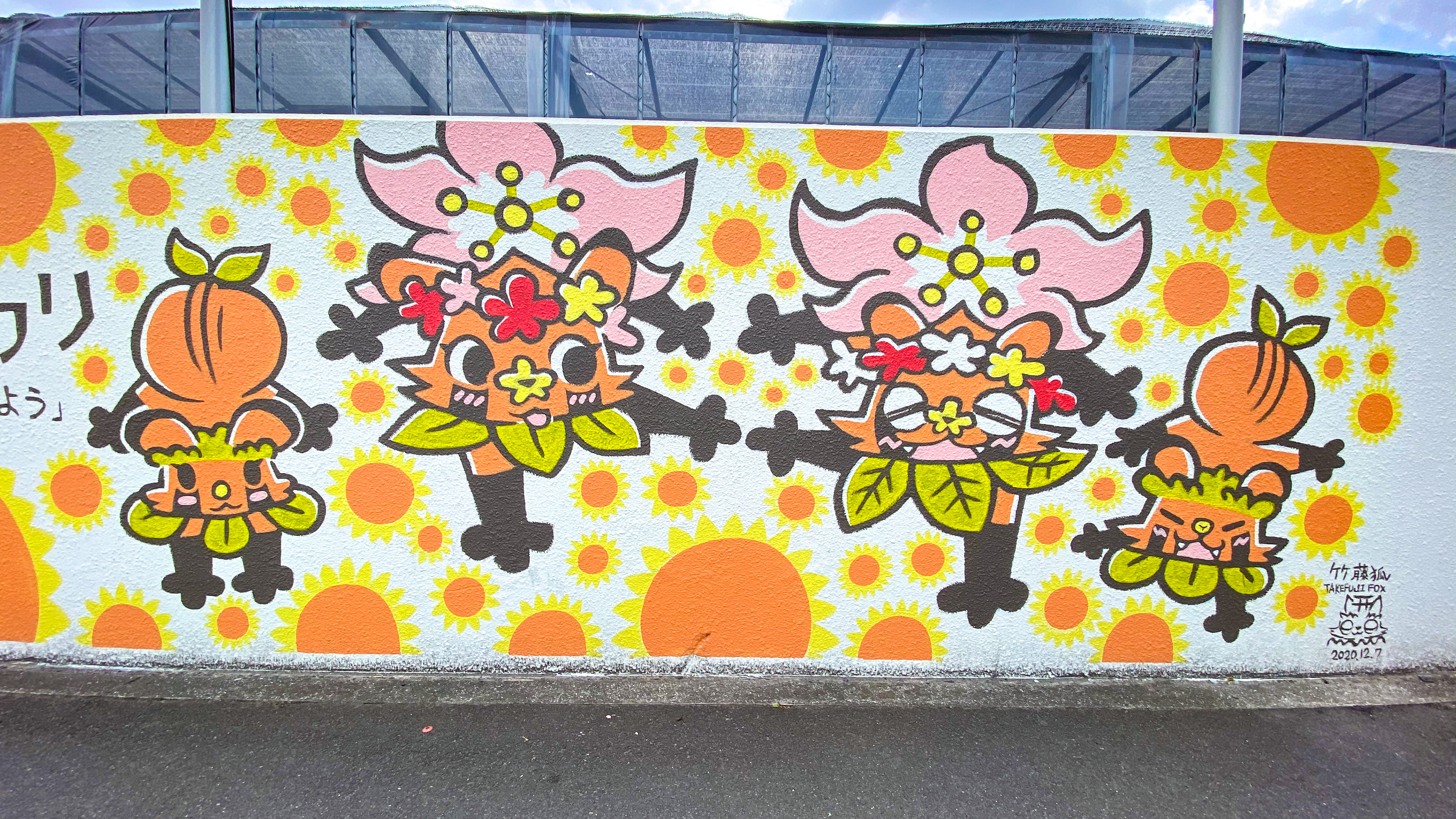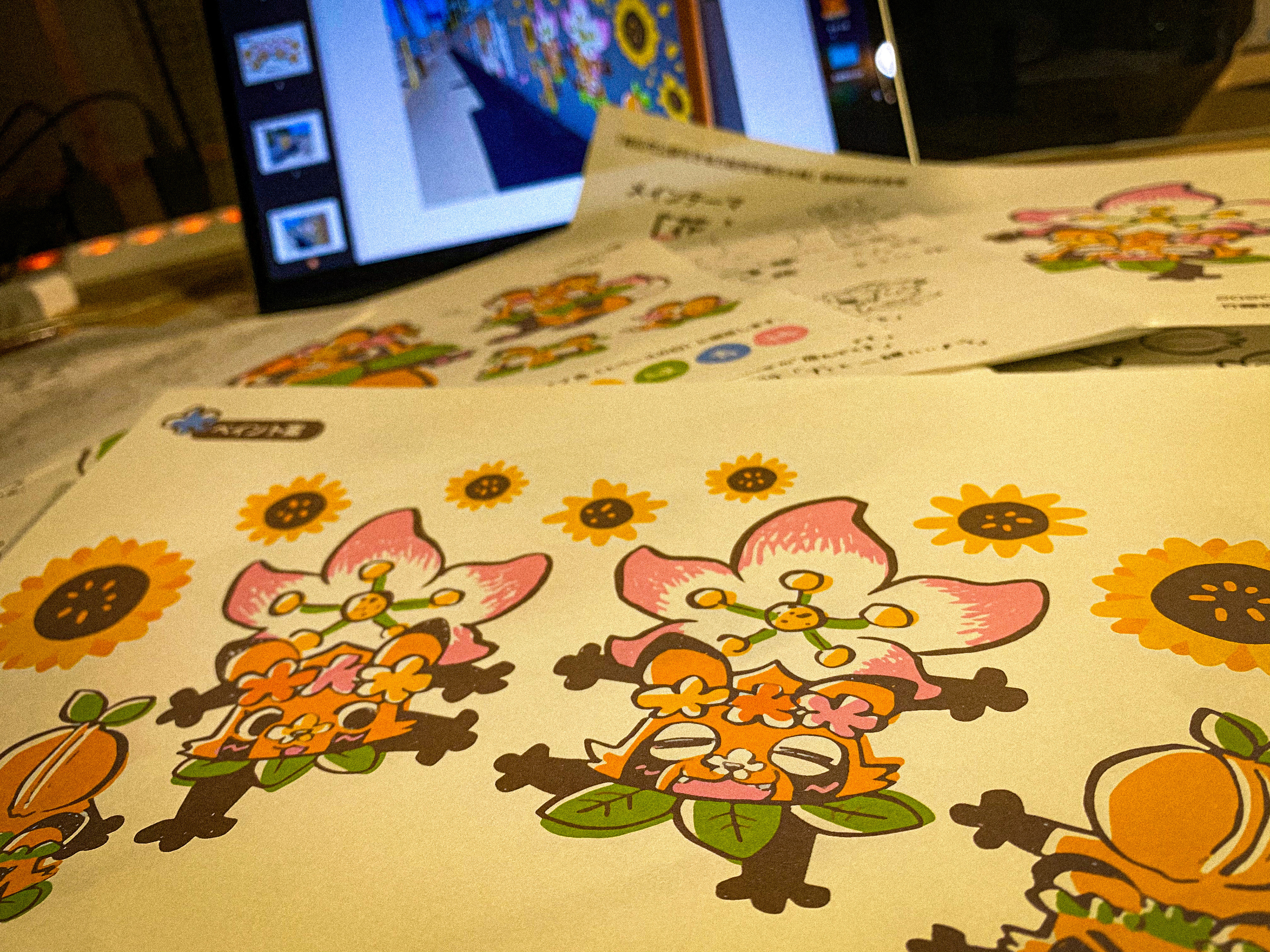 I painted a mural for the outer wall of "Takamatsu Sea & Sun Market" in Takamatsu City, Kagawa Prefecture. The elongated wall is likened to a picture scroll, expressing a story the flower raccoon dog character "Hanatanuki" with full of flowers. The story is sprinkled with Language of flowers and devised so that passersby will be interested in flowers.