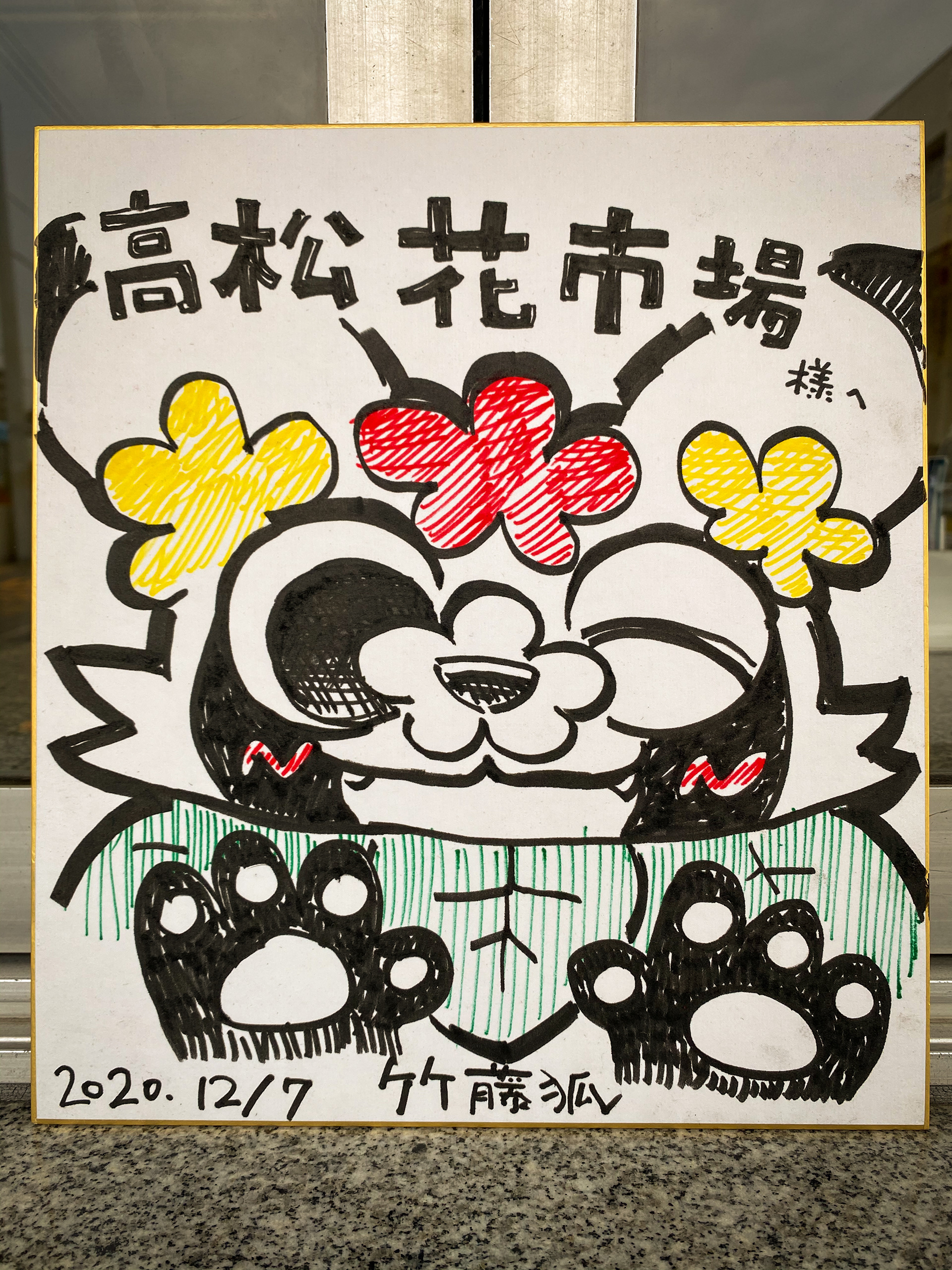 香川県高松市にある「高松中央卸売市場花き棟」外壁の壁画を制作させていただきました。細長い壁面を絵巻物に見立て、花とタヌキのキャラクター「花狸」の花にあふれた物語を表現しました。物語には花言葉を散りばめ、通行人の方々が花に興味を持って頂けるよう工夫しました。